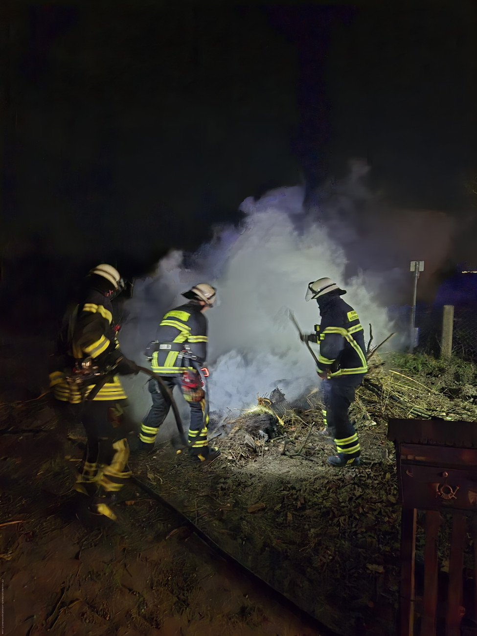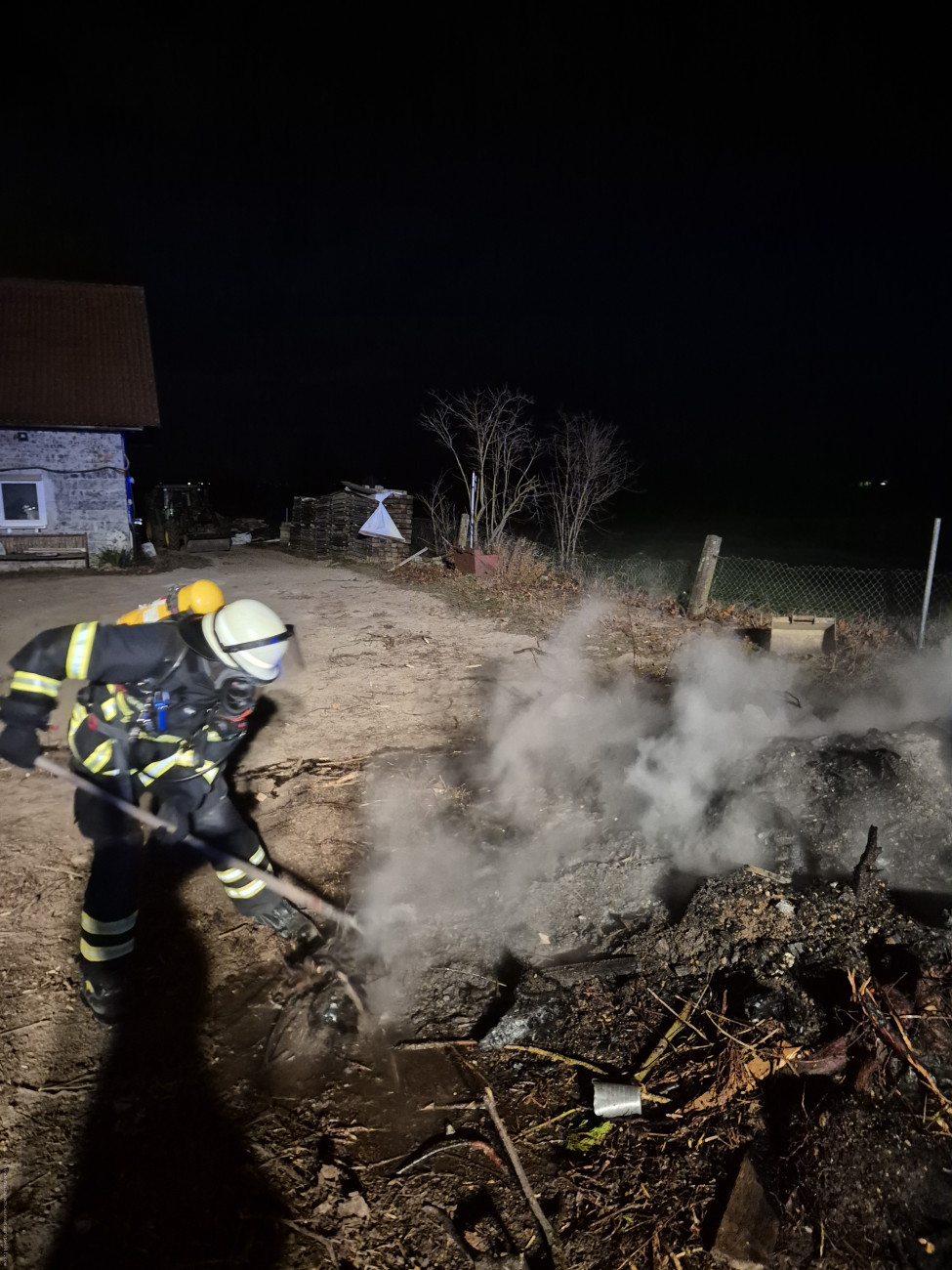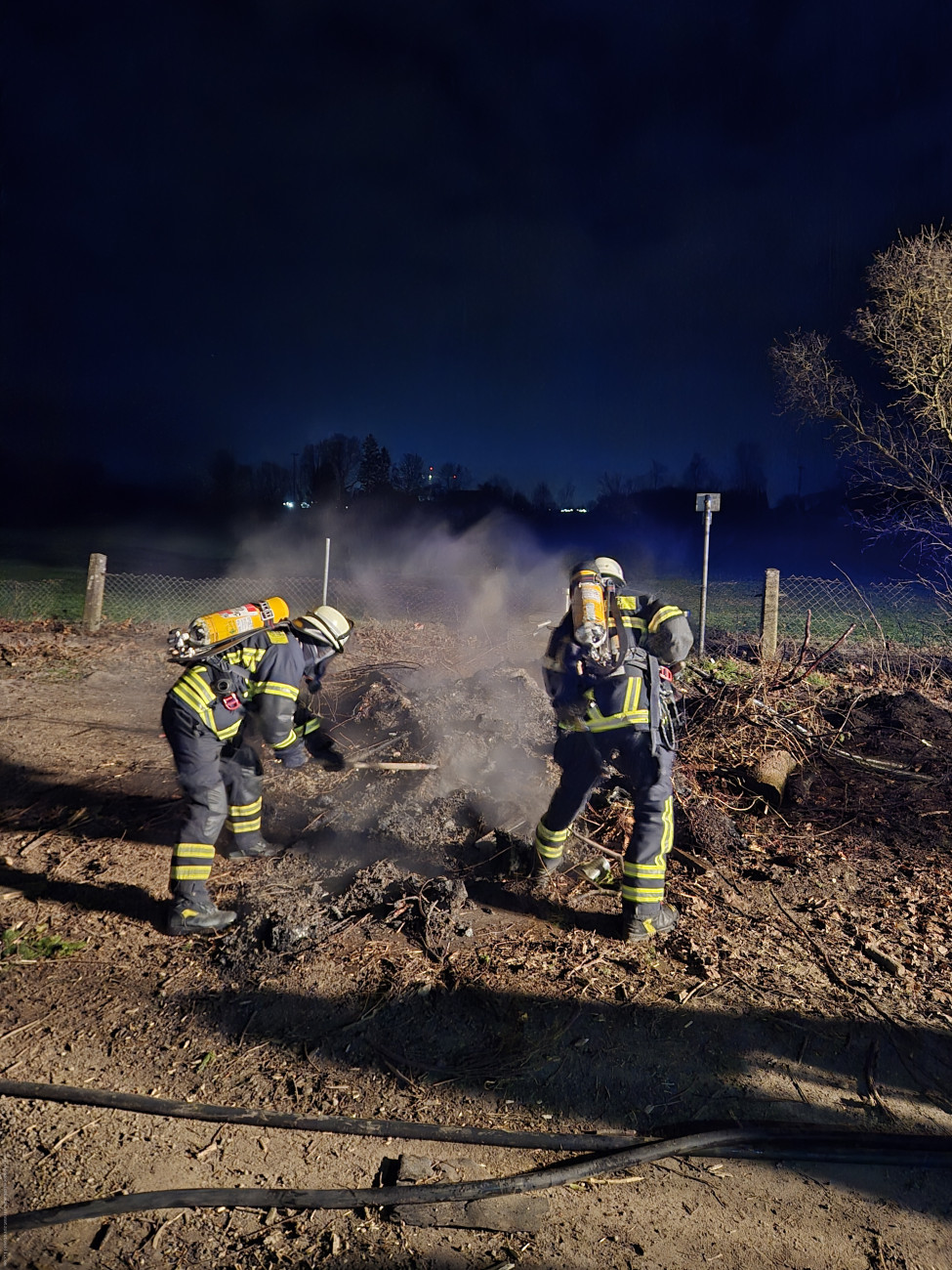 Bei Eintreffen an der Einsatzstelle stellte sich heraus, dass ein aufgeschichteter Haufen aus Wurzelstöcken in Brand geraten war. Zur Brandbekämpfung wurde der Haufen unter schwerem Atemschutz auseinandergezogen und mit rund 2.000 Litern Wasser vollständig abgelöscht.